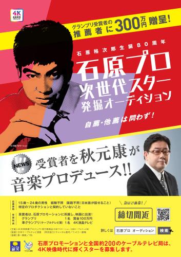 ≪国籍、経験問わず≫選考は国籍や経験を問わず、「日本語が話せること」「特定のプロダクションと契約していないこと」が条件。グランプリと準グランプリ(いずれも1人)は石原プロの所属俳優に。自薦の場合はグランプリに100万円、他薦なら推薦者にも300万円が贈られる。詳細は、検索サイトで「石原プロ オーディション」。