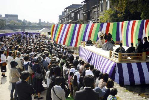 京都市の鴨川河川敷に特設された舞台で、創作舞踊を披露する市川海老蔵さん(手前) 海老蔵 歌舞伎発祥の鴨川河川敷で創作舞踊披露 ギャラリーで見る この記事のフォト 2015年10月25日の画像一覧 もっと見る 2015年10月25日の画像をもっと見る