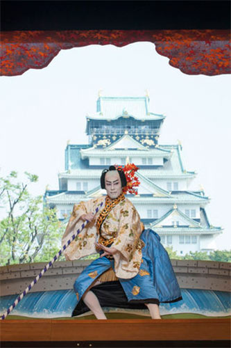 大阪城らしく木下藤吉郎(豊臣秀吉)ゆかりの舞踊「三升猿曲舞(しかくばしらさるのくせまい)」(昼の部)では、クライマックスで舞台後方の壁が倒れ、セットの一部のように天守閣が出現。豪華な仕掛けに満員の客席からは「おぉ~」とどよめきが起こり、「中村屋!」の大向こうと相まって最高潮に盛り上がった。公演は11月26日まで。