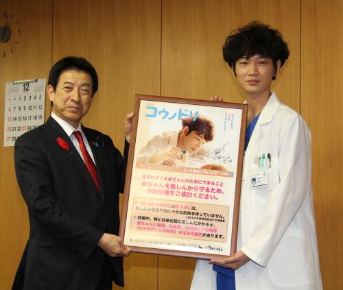 30日放送の第3話のテーマは妊婦の「風しん」。「風しん」について国民に広く理解と普及を図ることを目的とし、タイアップ企画の実施が決定。その企画の一環として、先天性風しん症候群について、予防接種の必要性などを啓発するメッセージを掲載したリーフレットを制作し、この日、綾野が同省へ出向き、塩崎大臣に収めた。