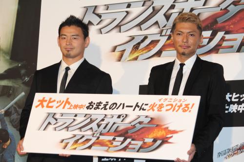 映画「トランスポーター イグニション」大ヒット記念舞台あいさつイベントに登場した五郎丸(左)と「EXILE」のSHOKICHI