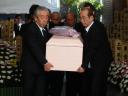 葬儀場から棺を運び出す志村けん(右)