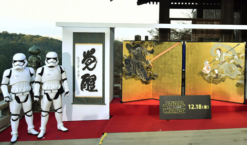 18日に映画「スター・ウォーズ/フォースの覚醒」が公開されることと琳派誕生400年を記念して、琳派を代表する俵屋宗達の「風神雷神図屏風(びょうぶ)」をモチーフに、映画の登場キャラクターを描いた屏風が30日、京都市東山区の清水寺でお披露目された。