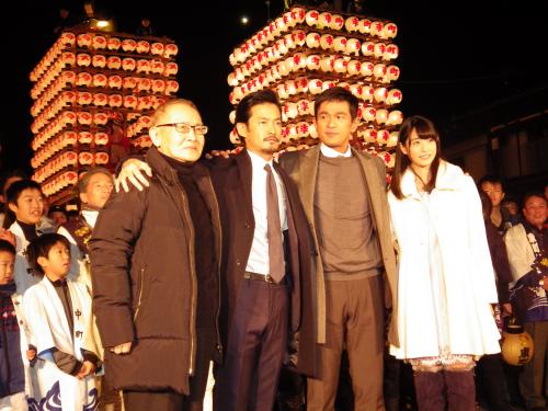 毎年10月1日に行われる地元の「曳山(ひきやま)まつり」を題材に、家族や人との絆を描いた物語。地元では高さ約8メートルの「曳山」と呼ばれる山車を4基出して、キャスト陣を歓迎した。山車が12月に出されるのは110年ぶり。竹野内は5月の撮影以来、7カ月ぶりの来訪で、映画の中で叫んだ祭りの掛け声「イヤサー!」を再び叫び、「本当にいつ聞いてもこの熱量は凄い。心に響きました」と感激の表情を浮かべた。