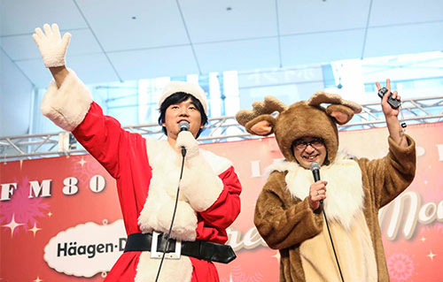 サンタ姿で登場した秦基博と、トナカイ姿のFM802のDJ・中島ヒロト(FM802提供)