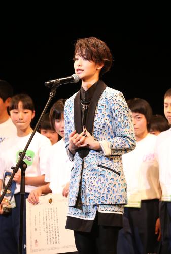剛力彩芽(中央)は自由曲中学生部門で文部科学大臣賞を授賞した佐野市立田沼西中学のワンダフルダンサーズのメンバーに祝辞を述べる