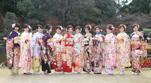 全員がミスキャンパスのファイナリストに選ばれた現役女子大生で、芸能事務所スペースクラフト所属の「キャンパスクイーン」12人が、東京・赤坂のホテルニューオータニで晴れ着姿を披露した。