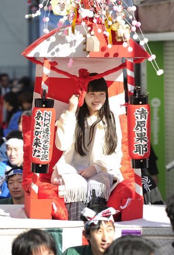 かごには、NHKの連続テレビ小説「あさが来た」にヒロインの嫁ぎ先の奉公人ふゆ役で出演している女優の清原果耶(13)や、俳優香川照之(50)らも乗り込んだ。
