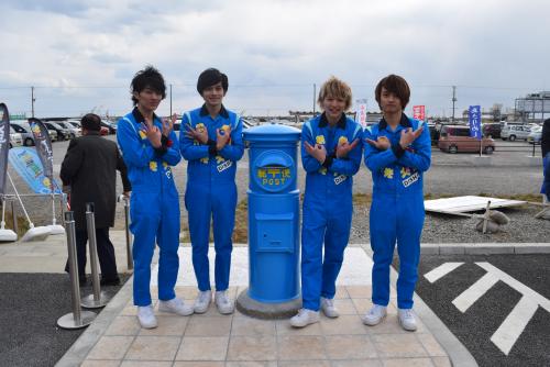 このポストは町の青い空と海をイメージし作られ、国内で設置されるのは初めて。4人は両親への日ごろの感謝をしたためたハガキを投函(とうかん)。それを、郵便配達員が回収し、そのまま配達に向かうという計らいもあった。TAKUMI(18)は「このポストで九十九里町がさらに盛り上がることを期待しています。僕らも観光大使としていろんな場所で素敵な九十九里町の良さをたくさんの人に知ってもらえるよう頑張ります」と話していた。