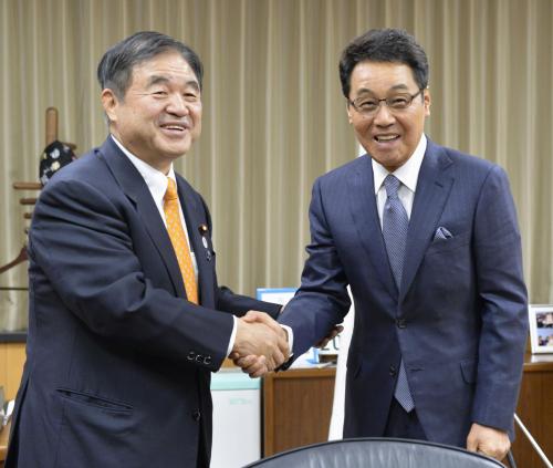 意見交換のため訪れた五木ひろし(右)を迎える遠藤五輪相