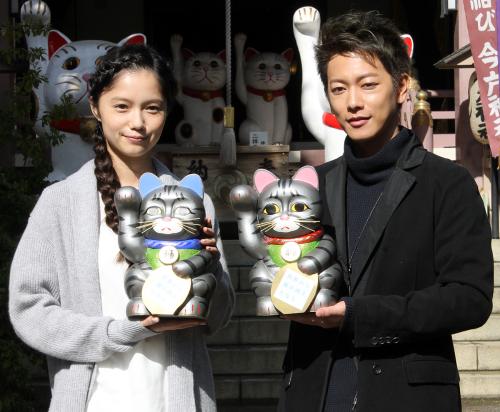 招き猫発祥の地と言われる同神社で、2人は映画に登場する2匹の猫、キャベツとレタスをイメージした招き猫を奉納し、佐藤は「こんな神社があるなんてビックリ。猫好きとしてうれしく思う」と神妙な面持ち。宮崎も「映画にピッタリの場所。祈祷(きとう)の太鼓が体に響いて、気持ちが新たになりました」と笑顔で話した。