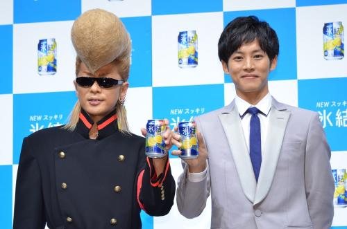 「キリン氷結」の新CM発表会見に出席した、綾小路翔(左)と俳優の松坂桃李