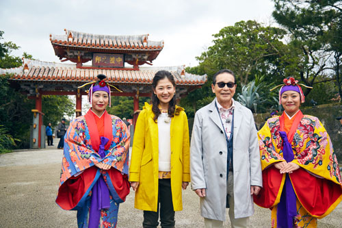 「ブラタモリ」で沖縄を訪れ、首里城守礼門の前でポーズを取るタモリ(右から2人目)と桑子真帆アナウンサー(左から2人目)(C)NHK