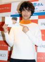 カレンダー発売イベントを行った中川大志。色紙に「海外に行きたい」と控えめな文字でしたためる