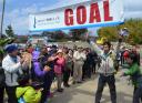 なすびは松川浦の公園で住民らに拍手で迎えられてゴール。「東北のみなさんが後押ししてくれて、諦めずに歩き切れた」と笑顔。昨年11月26日に八戸市の蕪島を出発。仕事による中断を挟み、44日間で歩き切った。