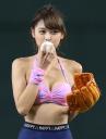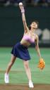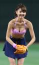 ピンクのトップとミニスカ風のビキニで登場し、ボールにキス。1メートル68の長身から力強いフォームで投げた球は惜しくもワンバウンドだった。「経験者の方と公園で練習を積んできた。ノーバンのはずだったのに」と悔しそう。「大谷(翔平)選手は年齢が1つ違いとは思えない迫力でした」と、1メートル93の体格に圧倒されていた。