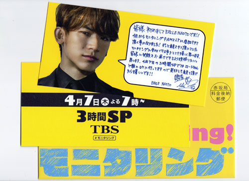 5日頃からツイッター上でメッセージカードの画像がアップされ、「NAOTOがモニタリングファミリーになるよ!」「NAOTOさんモニタリングのレギュラーなんだね!おめでとう」とファンが喜ぶツイートがあふれかえった。