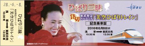 “美空ひばり尽くし”の1泊2日の特別ツアーが開催される。東武鉄道が貸し切り特急スペーシアを「美空ひばりトレイン」として運行。6月8日にひばりさんの母の故郷である東京・浅草を出発し、父の故郷の栃木・日光に宿泊する。