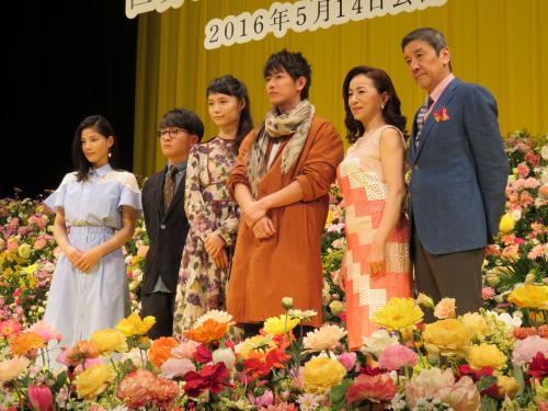 映画「世界から猫が消えたなら」の完成披露試写会で舞台あいさつした、(左から)石井杏奈、濱田岳、宮崎あおい、佐藤健、原田美枝子、奥田瑛二。