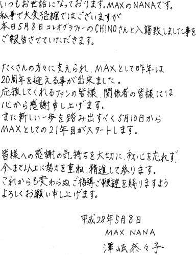 結婚を発表した「MAX」のNANA NANA、直筆ファックスで結婚報告 6歳上ダンサーCHINOと ギャラリーで見る この記事のフォト 2016年05月09日の画像一覧 もっと見る 2016年05月09日の画像をもっと見る