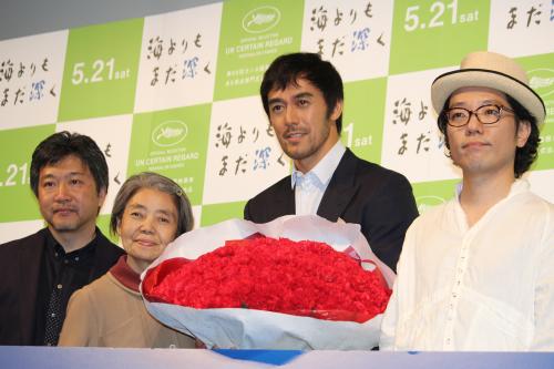 俳優の阿部寛(51)と女優の樹木希林(73)が8日、都内で行われた映画「海よりもまだ深く」(監督是枝裕和、21日公開)の母の日トークイベントに参加した。阿部は樹木にカーネーション200本をプレゼント。2人でステージから客席に降り、その花束の中から数十本を来場者に配った。