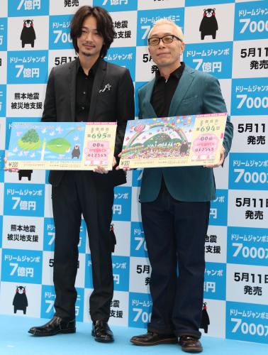 「ドリームジャンボ宝くじ」は1等5億円、前後賞が各1億円で1等・前後賞合わせて7億円が当たる超豪華賞金が魅力。収益金の一部が熊本地震の被災地支援に役立てられるとあって、所は「普段は10枚買う人は13枚買うなど多めに買って支援していただきたい。当たったらご褒美だと思って」と呼び掛けた。綾野も「被災地に私どもにできることで応援できるのはうれしいし、素晴らしいと思います」と話した。発売は6月3日まで、抽せん日は同9日。