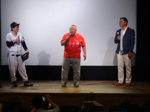 映画「蔦監督~高校野球を変えた男の真実~」(監督蔦哲一朗)の舞台あいさつに登場した(左から)蔦哲一朗監督、松村邦洋、宮内仁一氏