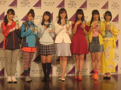 「From AQUA」新CM記者発表会に出席した乃木坂46の(左から)中元日芽香、桜井玲香、斎藤飛鳥、白石麻衣、西野七瀬、松村沙友理、堀未央奈