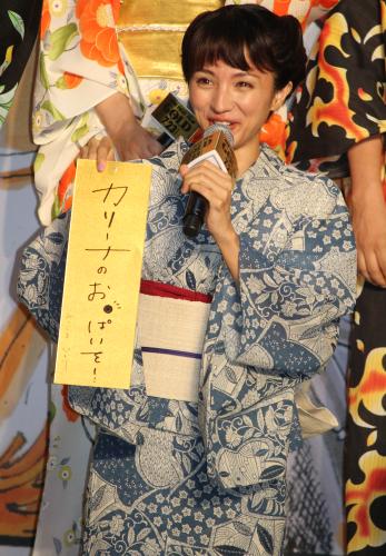 劇中では歌声も披露するが「歌は楽しかった。(原作者の)尾田(栄一郎)さんもレコーディング来てくれて満足して帰っていただけたので良かったなと思っています」と語っていた。もうすぐ七夕ということで、願いごとを書いたゴールドの短冊を披露する一幕も。満島のお願いごとは「カリーナのおっぱいを!」。魅惑のスタイルの持ち主で「すっごい(胸が)大きいんですよ!一度体験してみたい」と興奮。共にゲスト声優を務めた菜々緒(27)も「ボンキュッボンのスタイルは一度はなってみたい。ボンの方はあきらめているので…」と苦笑いだった。