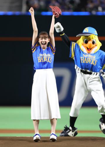 6月27日の東京ドームでの「鷹の祭典」ではマウンド手前にボールを叩きつける大暴投に終わったが、この日は練習でエースの武田から助言を受けた成果を発揮してノーバウンド投球。「絶対ノーバンでと思っていました。思いが届きました」とキュートな笑顔を振りまいていた。