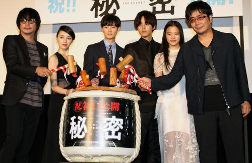 映画「秘密」の初日舞台あいさつを行った(左から)大森南朋、栗山千明、岡田将生、松坂桃李、織田梨沙、大友啓史監督