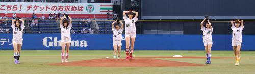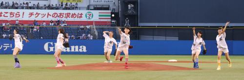 試合前、関根(左から4人目)と記念撮影に納まるLa PomPon 「ラ ポンポン」が始球式 HINAワンバン投球にホッ ギャラリーで見る この記事のフォト 2016年08月10日の画像一覧 もっと見る 2016年08月10日の画像をもっと見る