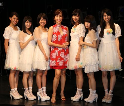 さんみゅ~&早見優「純白歌合戦#3」に出演した早見優(中央)とさんみゅ~の(左から)西園みすず、野田真実、長谷川怜華、木下綾菜、新原聖生、小林弥生