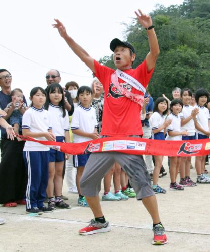 「RUN FORWARD KANPEI みちのくマラソン」でゴールする間寛平