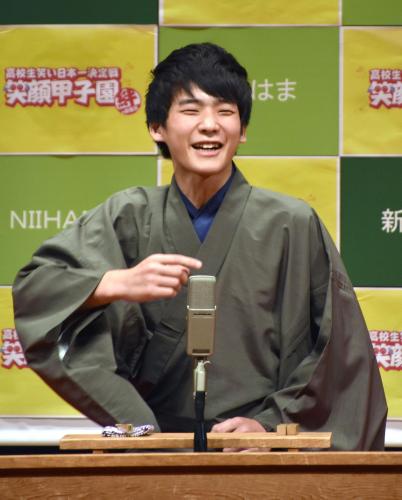 高校生が漫才やコントなどでお笑いの日本一を競う第6回「笑顔甲子園」の決勝が28日、愛媛県新居浜市で開かれ、京都府立桃山高3年の弘田敏基さん(17)=芸名「無敵亭大我(むてきていたいが)」=がグランプリを受賞した。