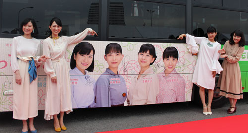 神戸ポートタワー前での「べっぴんさん」ラッピングバスお披露目セレモニーに参加した(右から)百田夏菜子、芳根京子、谷村美月、土村芳