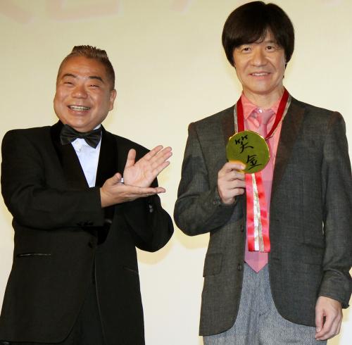 映画「金メダル男」のヒット御礼舞台挨拶を行った内村光良(右)とサプライズで登場した出川哲朗