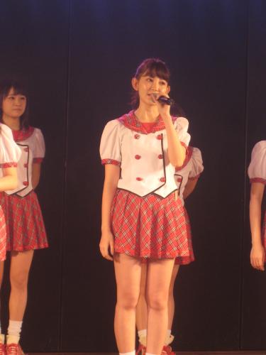 AKB48劇場公演で、グループ初期の曲「スカート、ひらり」の衣装で話す小嶋陽菜