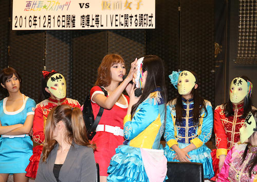 調印式に挑んだ恵比寿★マスカッツと仮面女子 Photo by スポニチ 恵比寿★マスカッツVS仮面女子“一触即発”12・16対決ライブ ギャラリーで見る この記事のフォト 2016年11月27日の画像一覧 もっと見る 2016年11月27日の画像をもっと見る