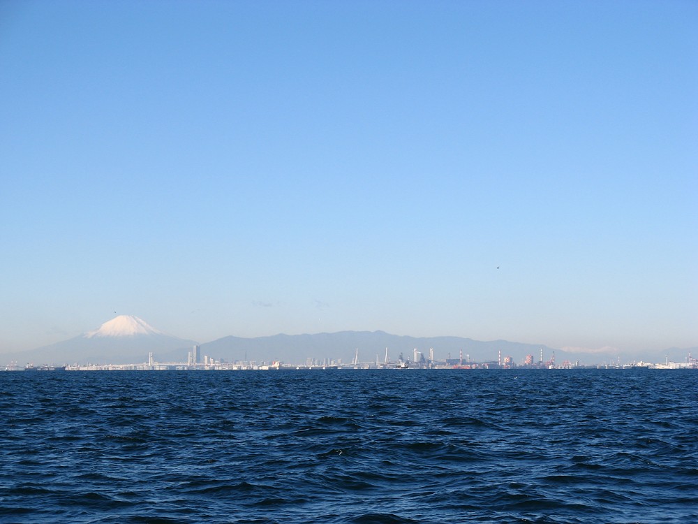 ベイブリッジ、ランドマークタワーの背景に富士山。山の稜線を右にたどっていくと雪山が。これが北岳