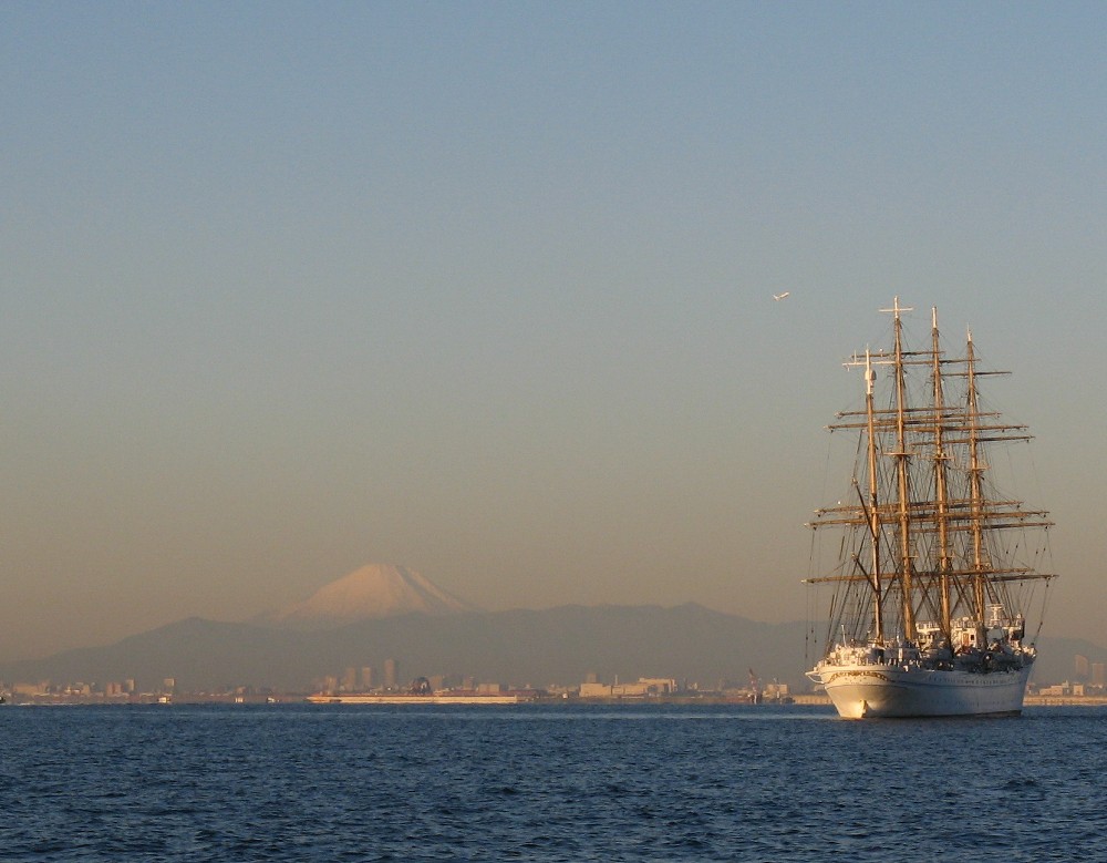 停泊中の帆船と富士山