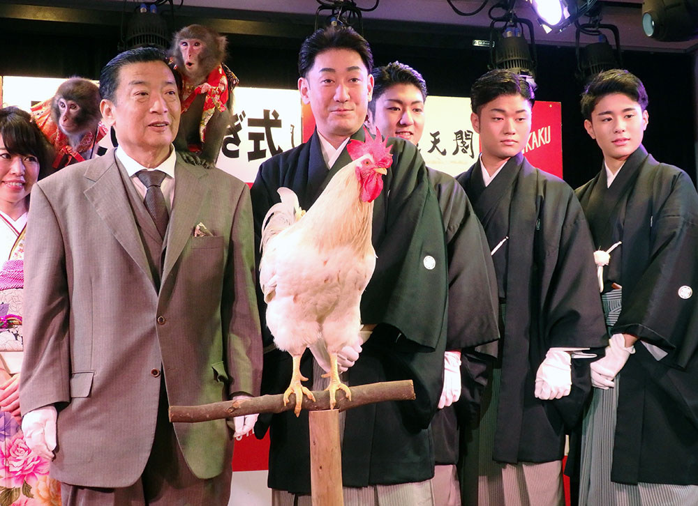 今年と来年の干支(えと)に当たるサルとニワトリが対面し、バトンタッチ。今回で61回目となる伝統行事に大阪松竹座での襲名披露公演(来年1月2〜26日)を控える息子の橋之助(21)、福之助(19)、歌之助(15)と共に駆けつけた芝翫は、「父から芝翫を引継ぎ、橋之助を長男に引き継ぐ。私どもも伝統を引き継ぐということで、(この場に)大変にふさわしい気がする」と笑顔で語った。