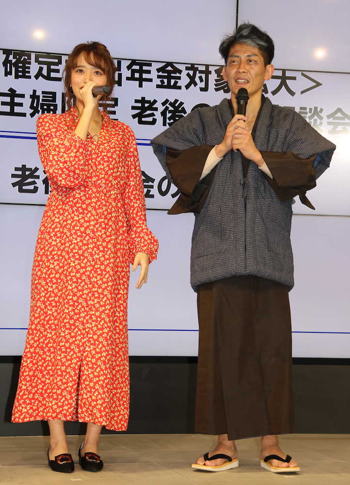 「SBI証券主婦向けiDeCo講座&ワークショップ」にゲストで登場した“おじいちゃんメーク”のジャングルポケット太田博久と、妻の近藤千尋。近藤はゆったりワンピースでお腹もふっくら