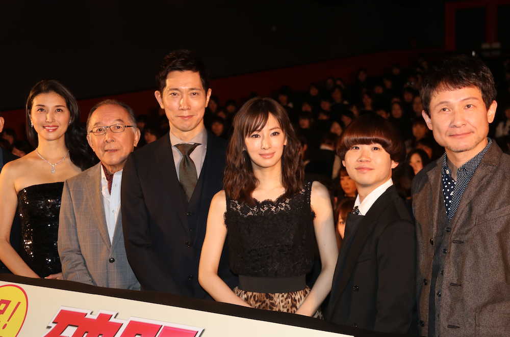 映画映画「破門ふたりのヤクビョーガミ」初日舞台あいさつに登壇した(左から)橋本マナミ、橋爪功、佐々木蔵之介、北川景子、矢本悠馬、木下ほうか