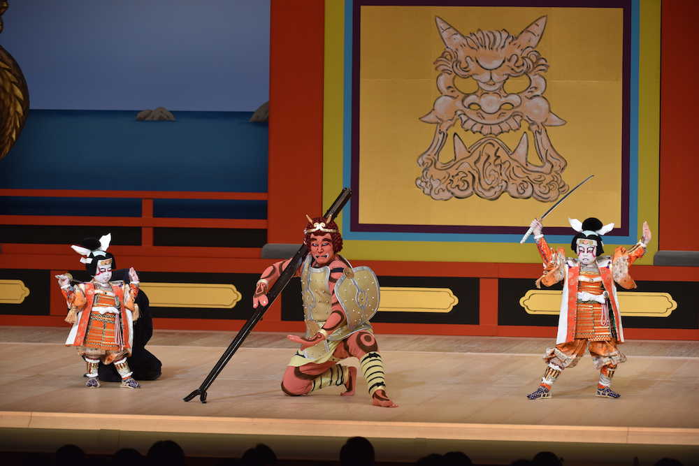 桃太郎を演じた2人の最初のセリフは「おじいさん、おばあさん、こんにちは」。その後も無難に務めたばかりか4度見えを切るシーンもあり、満員の客席からは何度も温かい拍手が起こった。