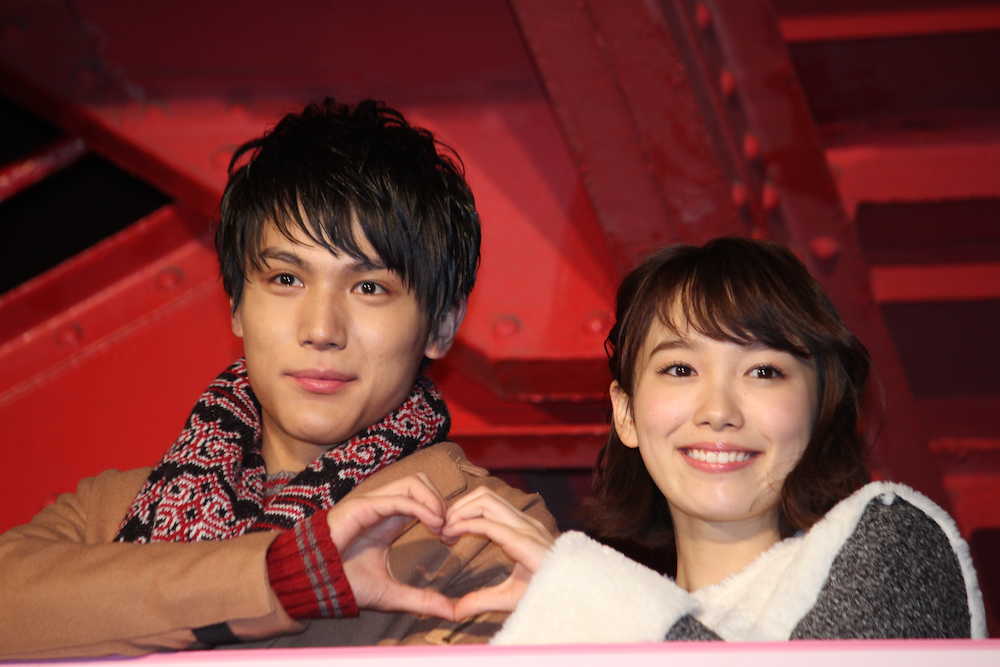 「きょうのキラ君」ヒット祈願バレンタインイベントで点灯式を行った中川大志(左)と飯豊まりえ