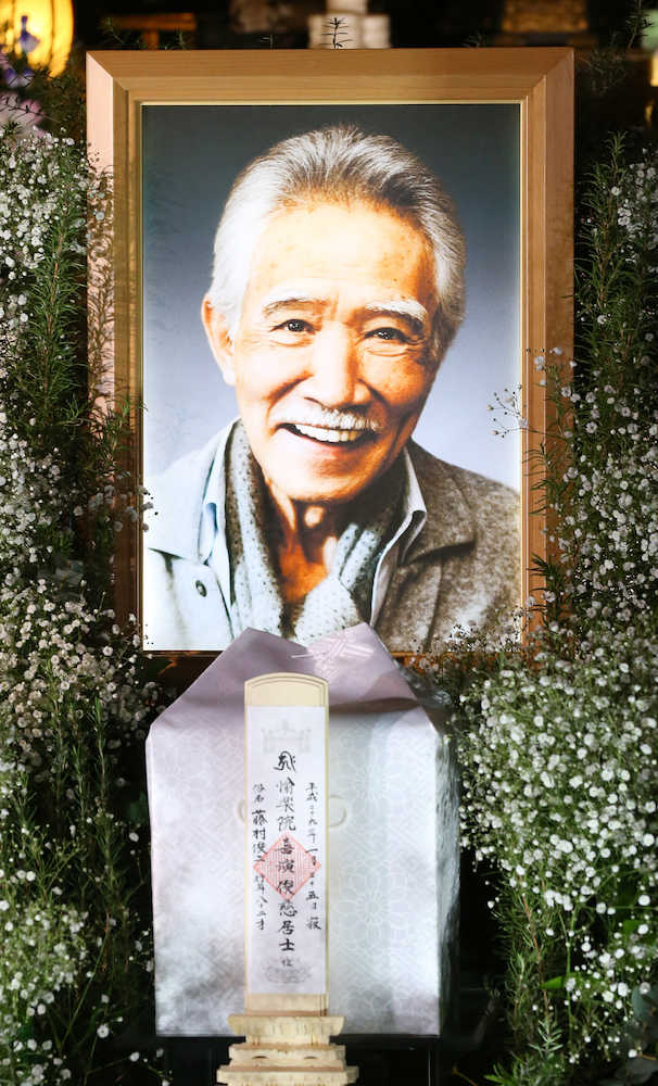 にっこりほほ笑む遺影は2009年、雑誌の取材で撮影されたもの。祭壇の横には7年前まで経営していたバー「オヒョイズ」の看板や自家製赤ワインなども置かれた。バーを訪れたことがある小堺一機(61)は藤村さんの意外な一面を披露。「マナーの悪い客に、お金はいらないので帰ってください、二度と来ないでね、とたしなめていた」という。普段はニコニコしていても、時と場合によっては毅然(きぜん)とした態度をとる“昭和ひとケタ世代”のカッコ良さ。「昭和九年会」の創立メンバーで俳優の森山周一郎(82)は「何もしていないようでちゃんとしている。それがおヒョイでした」と、独特の存在感を振り返った。