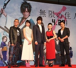 映画「無限の住人」完成報告記者会見に出席した(左から)三池崇史監督、戸田恵梨香、福士蒼汰、杉咲花、市原隼人
