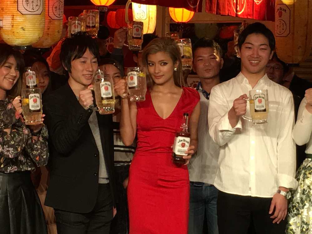 世界NO.1バーボン「ジムビーム」のCMに出演中のローラ。この日、渋谷肉横丁にCMの世界観を再現した”ビームハイボール横丁”がオープンし、横丁客らとハイボールで乾杯した。