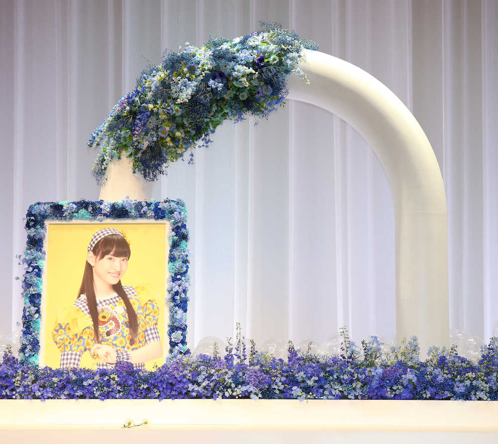 祭壇は、松野さんのメンバーカラーである青をイメージ。カーネーション、バラ、デルフィニウム、カスミ草、アジサイなど4000本の青い花で彩った華やかなものとなった。写真は、松野さんと両親が衣装を気に入っていたという8枚目のシングル「夏だぜジョニー」の宣材写真を使用。明るい表情の松野さんが笑顔を投げかけた。